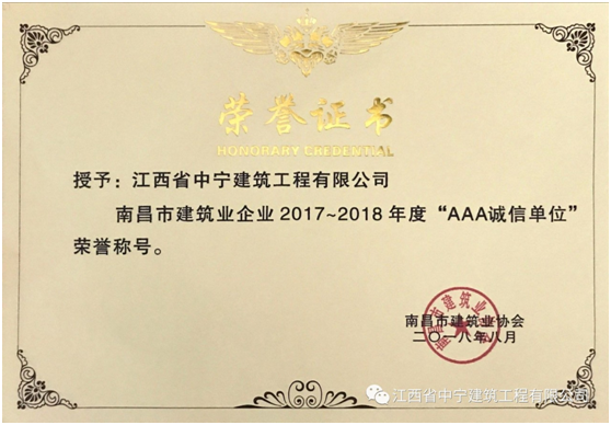 近日,由南昌市建筑業協會組織的2017-2018年度南昌建筑業企業誠信公布審批,我司榮獲“南昌市2017-2018年度AAA誠信單位”稱號,得此榮譽,離不開公司一直以來倡導的誠信企業文化,更離不開中寧人一直堅守的誠信信念。