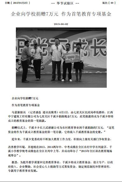 活動現場,胡總代表中寧建筑公司向干溪小學捐贈7萬元人民幣,作為該小學首筆教育專項基金。