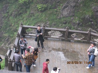 在明月廣場(chǎng)合完影后,大家一同欣賞著云姑沐月的唯美雕像。入景區(qū)的大門(mén)前擺放著各式叫賣(mài)的工藝品,無(wú)論大人與小孩都在停步觀(guān)賞,素不知還有更重要的事情在等待著我們。入大門(mén)整隊(duì)買(mǎi)票可不是件簡(jiǎn)單的事情,由于今日天氣好,踏春的人比較多。整個(gè)團(tuán)隊(duì)一同穿過(guò)詠月碑林時(shí),大家都在嘆為觀(guān)止,因?yàn)椋跓o(wú)數(shù)的碑文上記載著先人與后人對(duì)于明月山的敬仰。在朱熹涼亭前,大家商議,如何踏上明月山。因來(lái)的人群中有中寧幼小的子民,考慮再三,分兵兩路。幼童坐纜車(chē)上去,徐聰為小分隊(duì)隊(duì)長(zhǎng);其他成年人等,徒步上山,蔡文斌為先鋒官,胡董為隊(duì)長(zhǎng)。在目視小分隊(duì)踏上纜車(chē)的小途時(shí),我們也開(kāi)始了今天的艱巨任務(wù),完成踏上明月山的中寧夢(mèng)想。