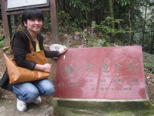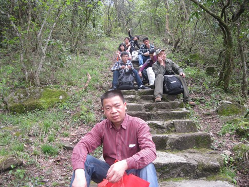 往上走的小徑越來(lái)越陡峭,在下山的人口中得知,索道中站就在前方不遠(yuǎn)的地方,心中暗喜:實(shí)在走不動(dòng),就坐纜車(chē)上去。15分鐘,我們順利的達(dá)到了索道中站,大家爭(zhēng)相拍照留念。現(xiàn)在想想,唯獨(dú),一心只想著休息的我,沒(méi)有在此處拍一張照片做紀(jì)念。現(xiàn)在看著他們婀娜、多姿的pose,讓人羨慕。旁邊的袁工在我前方喊著:“戴工,前面是一片平地,你手上的小竹桿可以扔掉了。”其實(shí),我早就想扔了,借袁工的話(huà),我順勢(shì)放棄了與小竹桿握手的機(jī)會(huì)。休息的時(shí)候,我也在想,這么累,胡董肯定會(huì)說(shuō)我們坐纜車(chē)上去的。然而,事非這般。胡董休息了一會(huì)兒喊著:“前面不遠(yuǎn)的地方,就是山頂了,我們繼續(xù)徒步前進(jìn),如果累了,我們每算200步就休息一下,先小目標(biāo),再大目標(biāo)。”